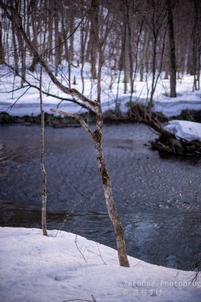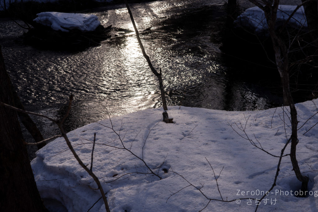 まずは軽くジャブでご挨拶。地面はほぼ雪で覆われていて、川は黒く流れています。