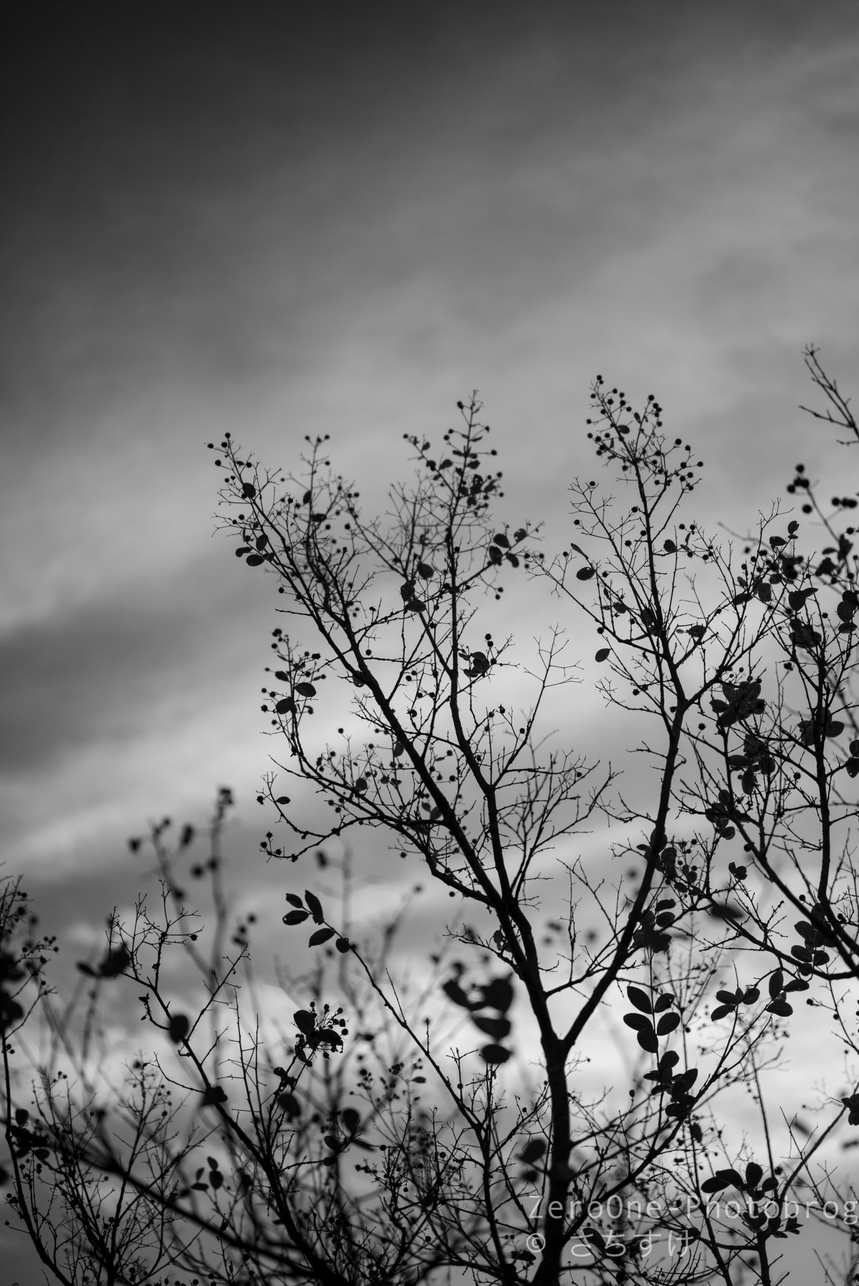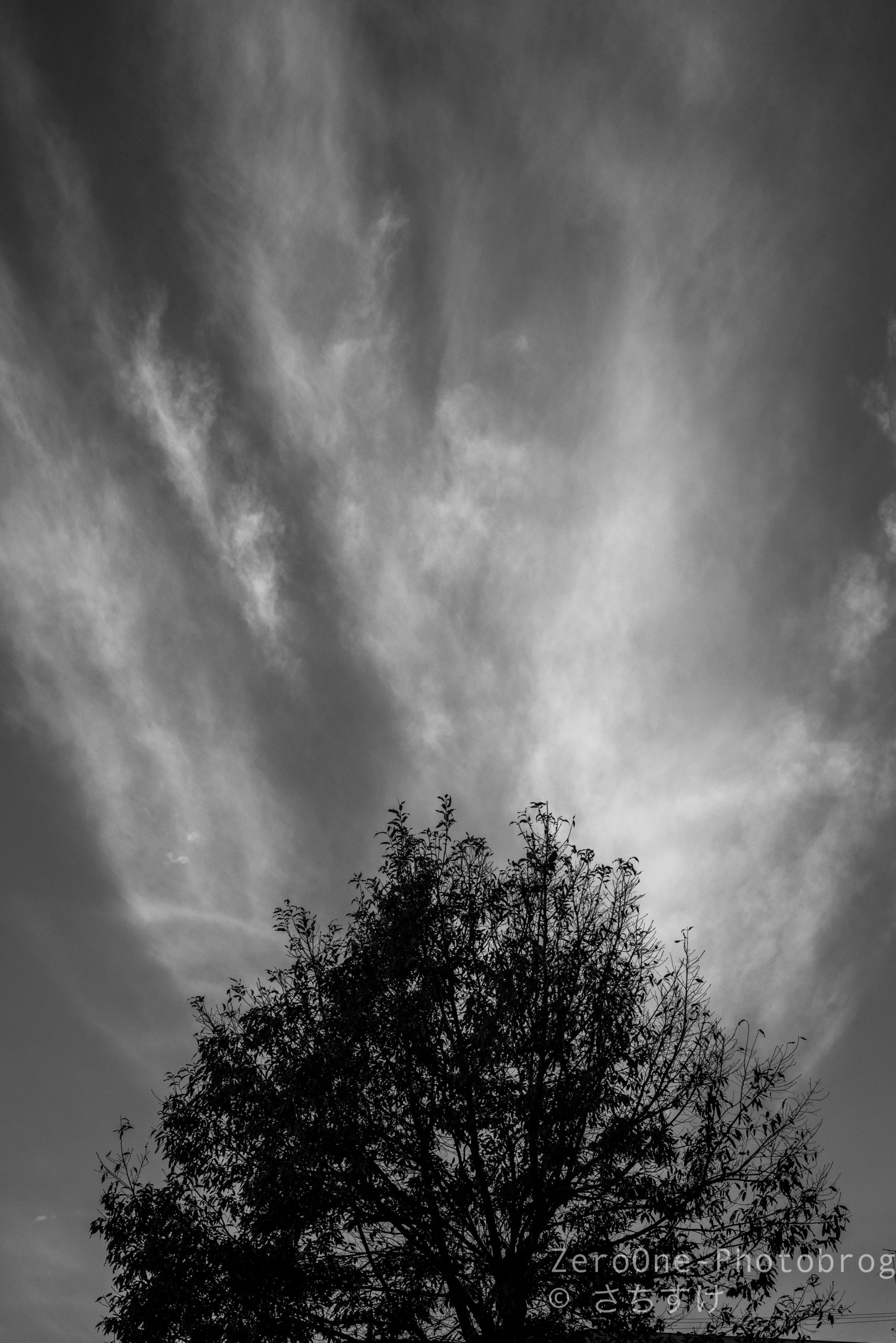 朝焼けの中の木のシルヘット。モノクロで朝焼けの色を想像するのも面白いです。